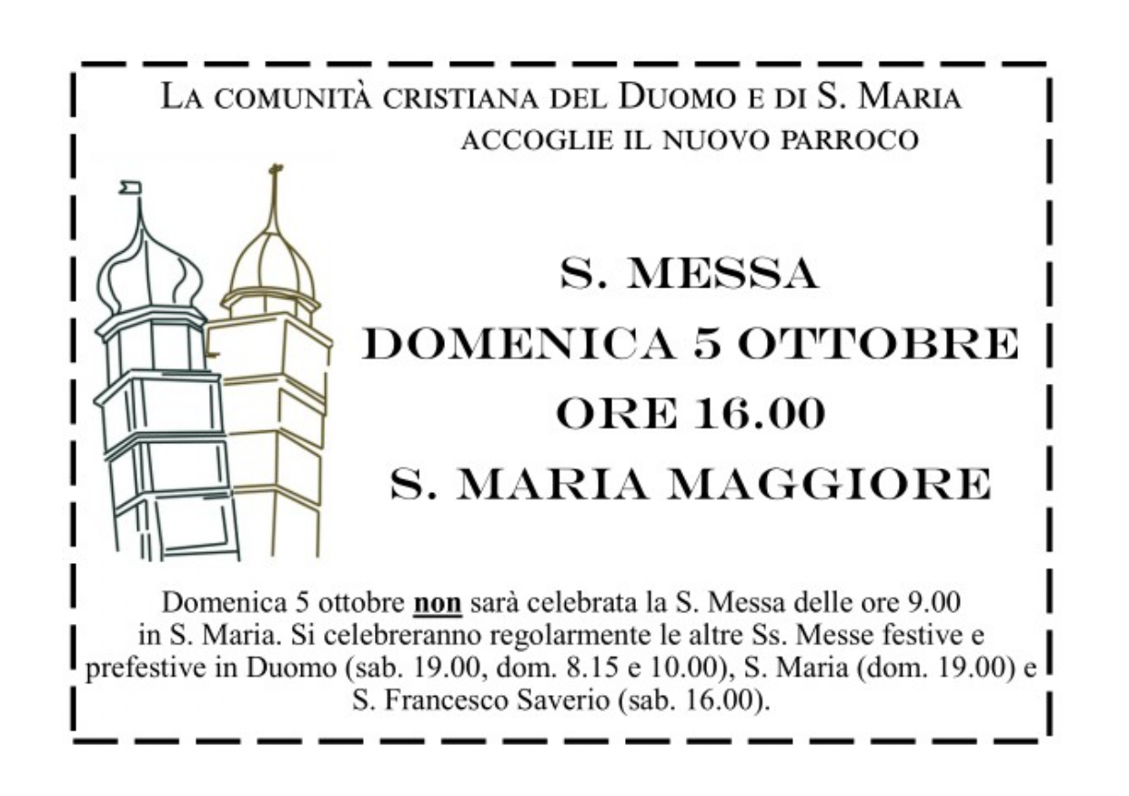 sabato alle ore 16.00 nella chiesa di S. Francesco Saverio. La S. Messa domenicale delle 11.15 in S. Maria Maggiore riprenderà con il 12 ottobre. MESSE FESTIVE: