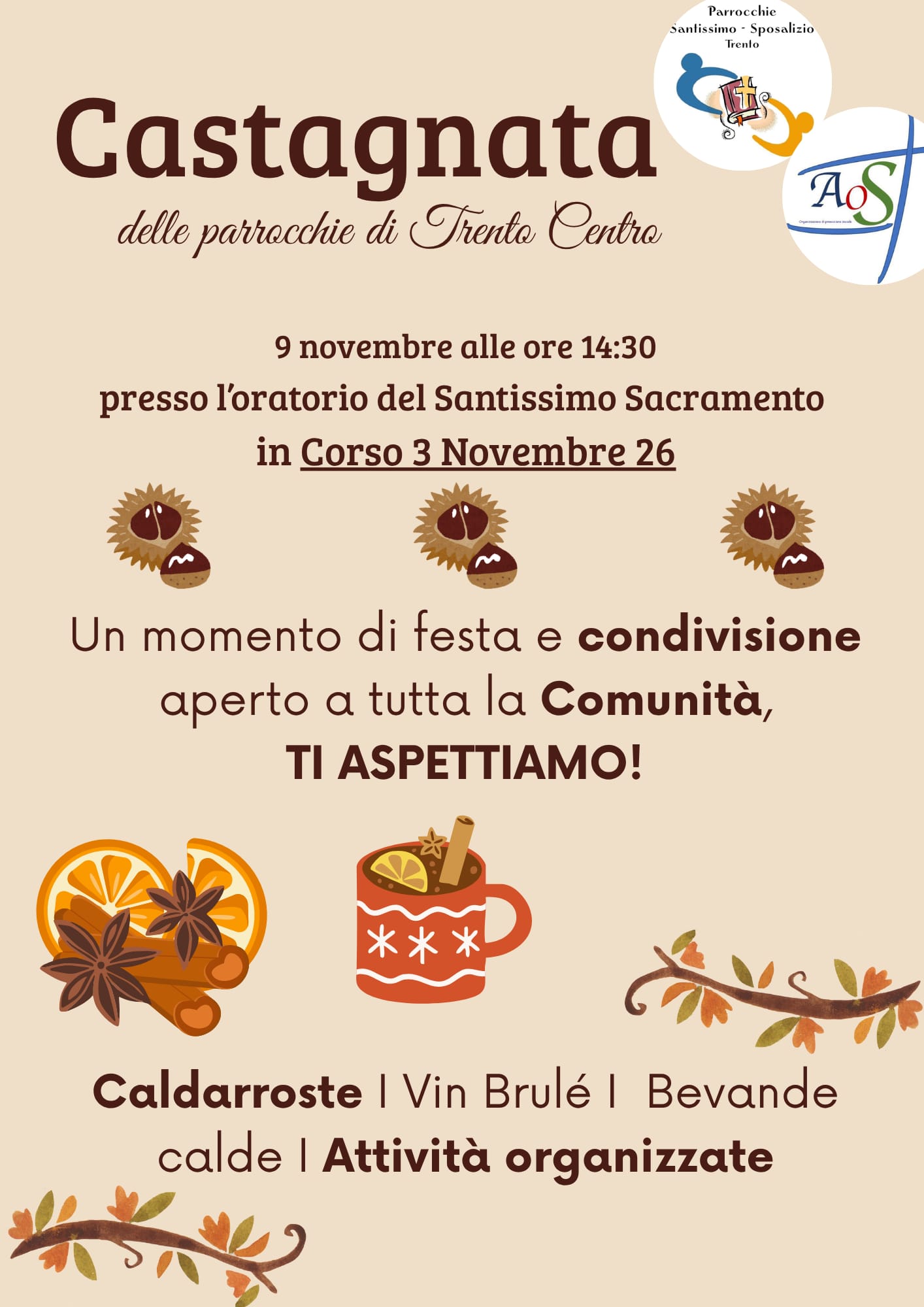 Domenica 9 novembre, dalle 14.30, presso l’Oratorio del Santissimo Sacramento (corso 3 Novembre 26), Castagnata delle parrocchie di Trento centro.
